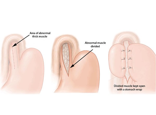 Under general anaesthesia, 5 small keyhole incisions are made on the abdomen and laparoscopic instruments are introduced. The lower oesophagus is approached and a lengthwise cut is made in the muscle layer of the lower oesophagus. Care is taken to cut only the muscle layer, leaving the inner lining of the oesophagus intact. As this procedure is often complicated by acid reflux after the operation, a partial or complete fundoplication is also performed at the same time to minimise this.