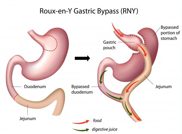2. Roux-en-Y Gastrojejunostomy (Gastric Bypass): A Small Pouch of stomach is made and food is bypassed in small powl, causing mal absorption & weight reduction.